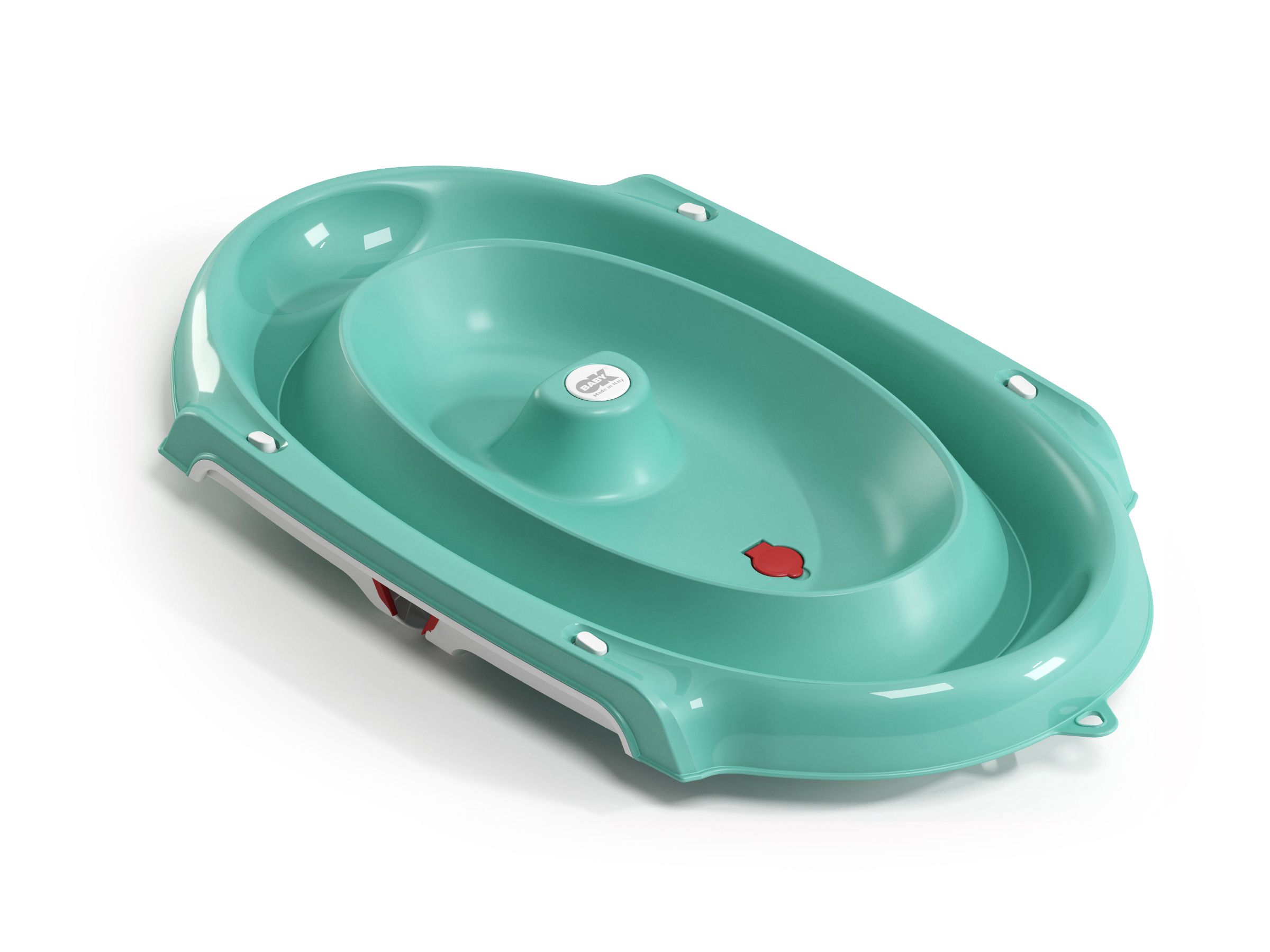 The bath tub is equipped with an asymmetric resting point between the legs adding extra support and encouraging better posture.